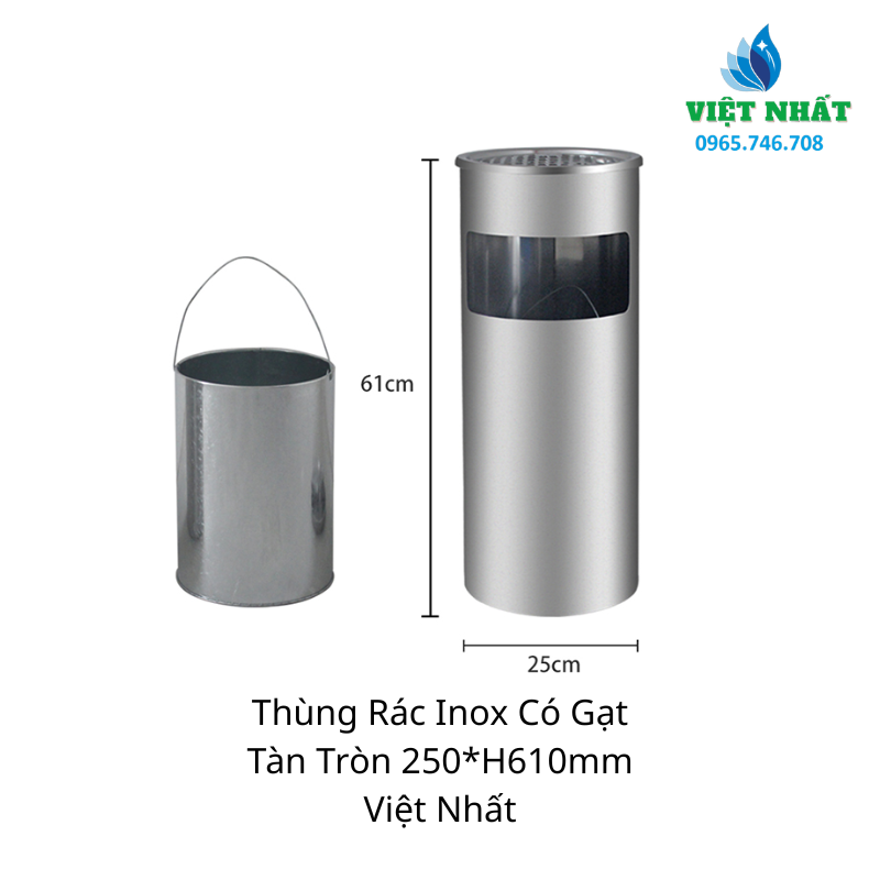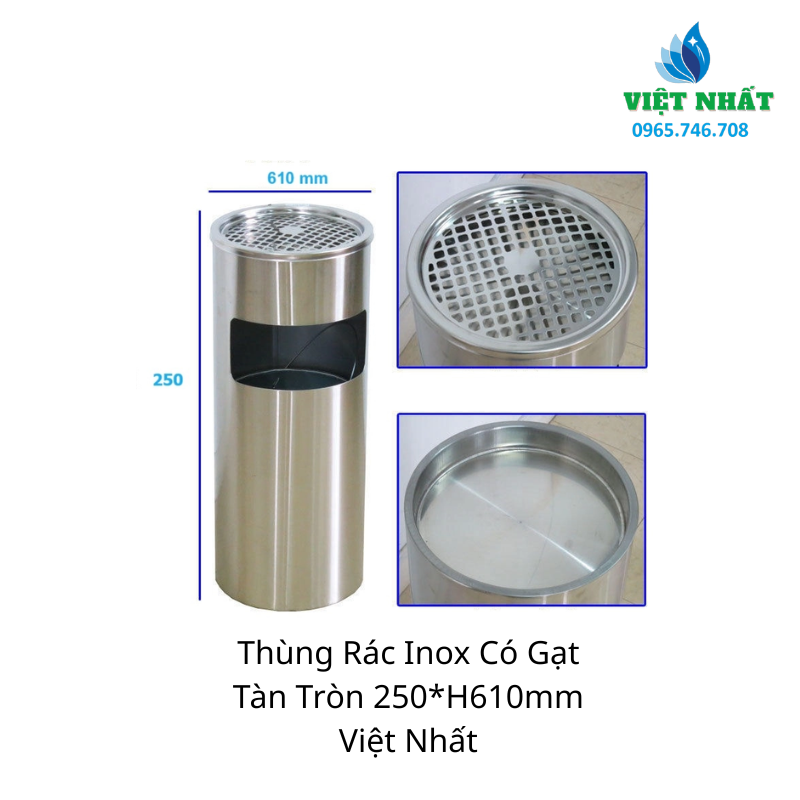 Thùng rác inox có gạt tàn tròn Việt Nhất là một sản phẩm tiện dụng và thẩm mỹ, được sử dụng phổ biến trong nhiều không gian như văn phòng, khách sạn, nhà hàng, cửa hàng và các khu công cộng. Với thiết kế chắc chắn và chất liệu inox bền bỉ, thùng rác inox Việt Nhất mang lại nhiều lợi ích cho người sử dụng.
