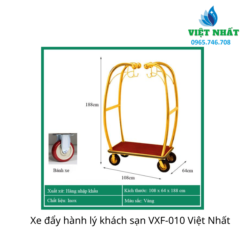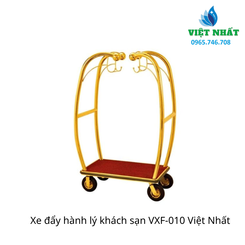 Xe đẩy hành lý khách sạn VXF-010 không chỉ đơn thuần là công cụ vận chuyển, mà còn là “gương mặt đại diện” cho sự sang trọng và đẳng cấp của khu vực tiền sảnh (Lobby). Với thiết kế dáng lồng chim kinh điển, khung Inox mạ vàng sáng bóng và thảm nhung đỏ quyền lực, mẫu xe này là trang bị tiêu chuẩn bắt buộc phải có tại các Khách sạn 3-5 sao, Resort nghỉ dưỡng cao cấp và các khu căn hộ hạng sang, giúp nâng tầm trải nghiệm của khách hàng ngay từ giây phút Check-in đầu tiên.