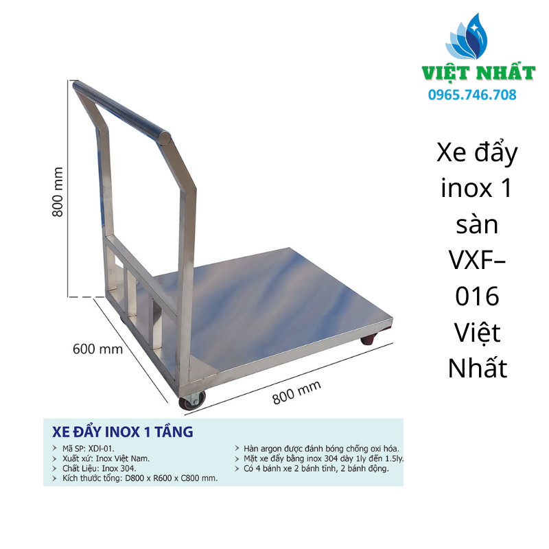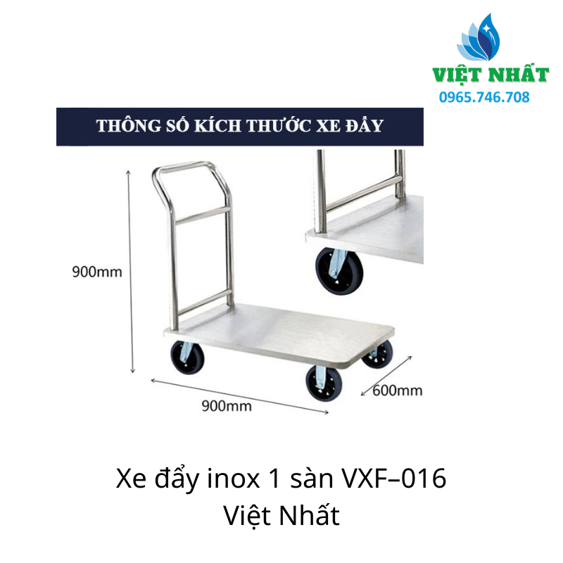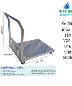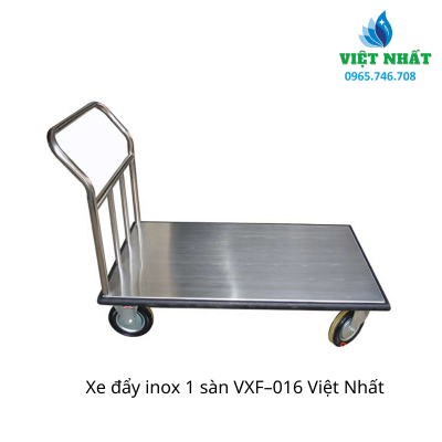 Xe đẩy inox 1 sàn VXF–016 là giải pháp vận chuyển hàng hóa chuyên dụng dành cho những môi trường đòi hỏi tiêu chuẩn vệ sinh khắt khe nhất như Bệnh viện, Bếp ăn công nghiệp, Nhà hàng và các Phòng sạch. Khác với xe đẩy khung thép sơn thông thường, dòng xe inox này sở hữu vẻ ngoài sáng bóng vĩnh cửu, khả năng chống ăn mòn tuyệt đối và độ bền cơ học ấn tượng, giúp bạn yên tâm sử dụng trong môi trường ẩm ướt hay tiếp xúc hóa chất mà không lo gỉ sét.